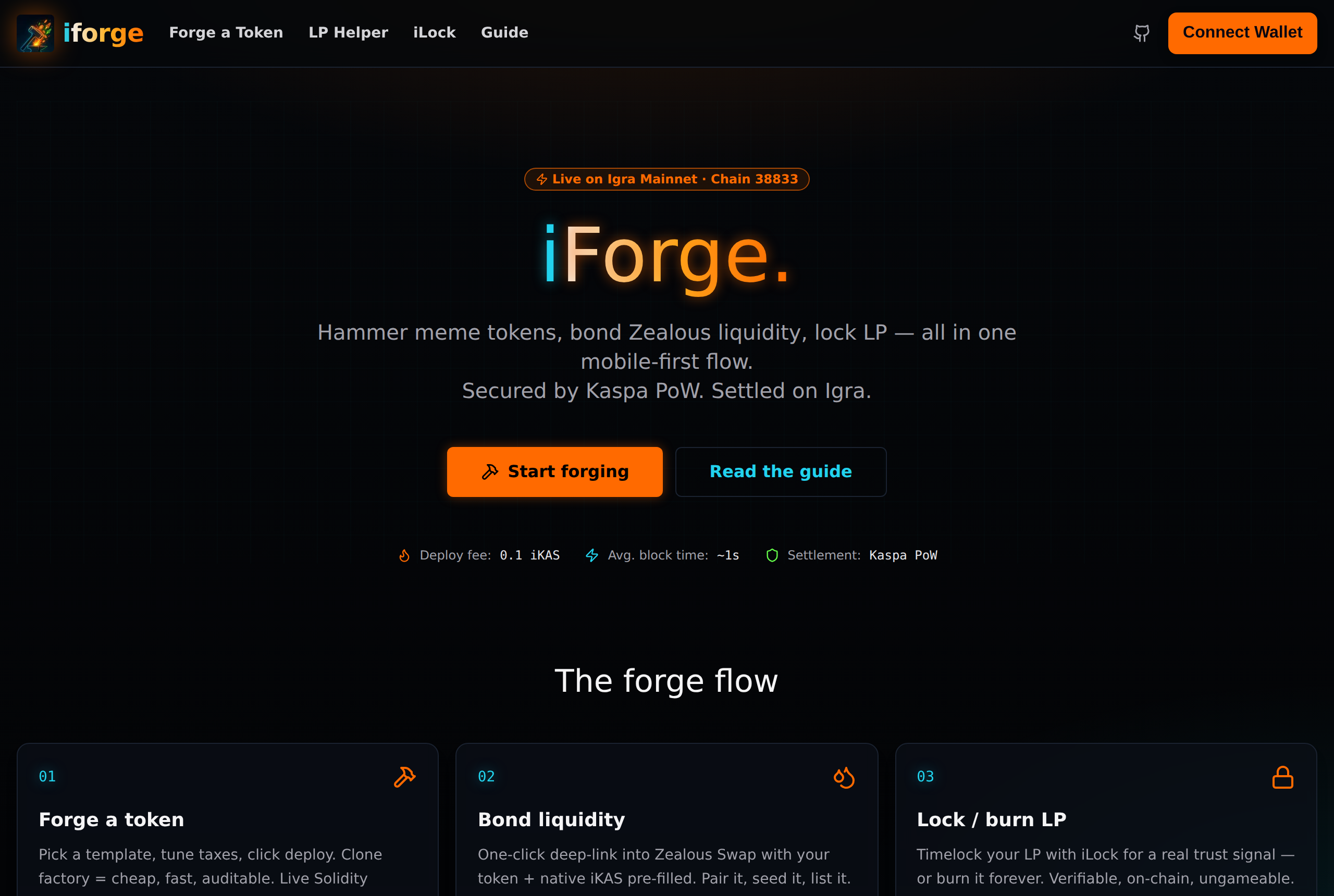 A pump.fun-style meme-token forge for the Kaspa & L2 ecosystem. Deploy a tax token in one click, seed liquidity on Zealous, activate taxes against the real pair, and lock — all from one connected wallet, all on-chain.